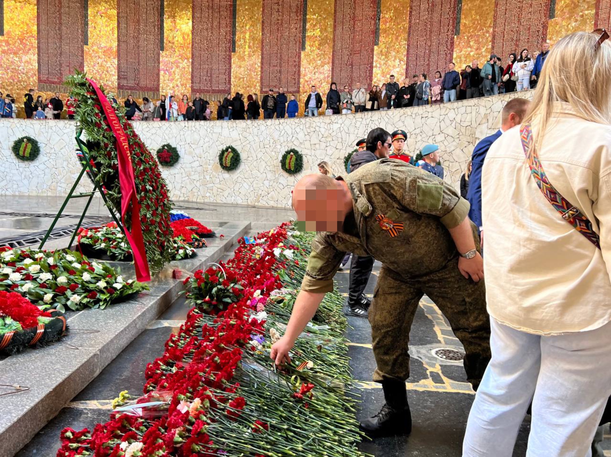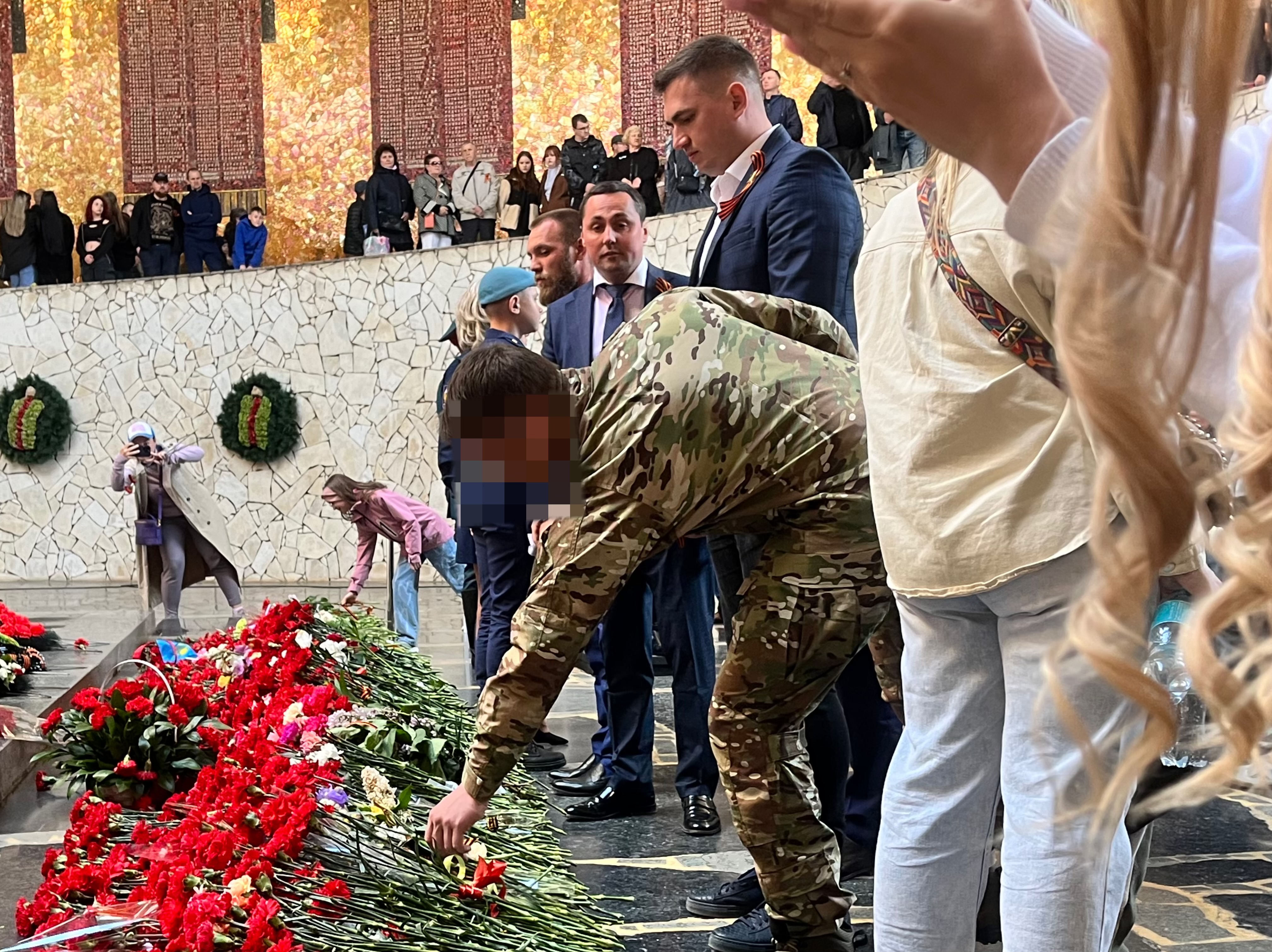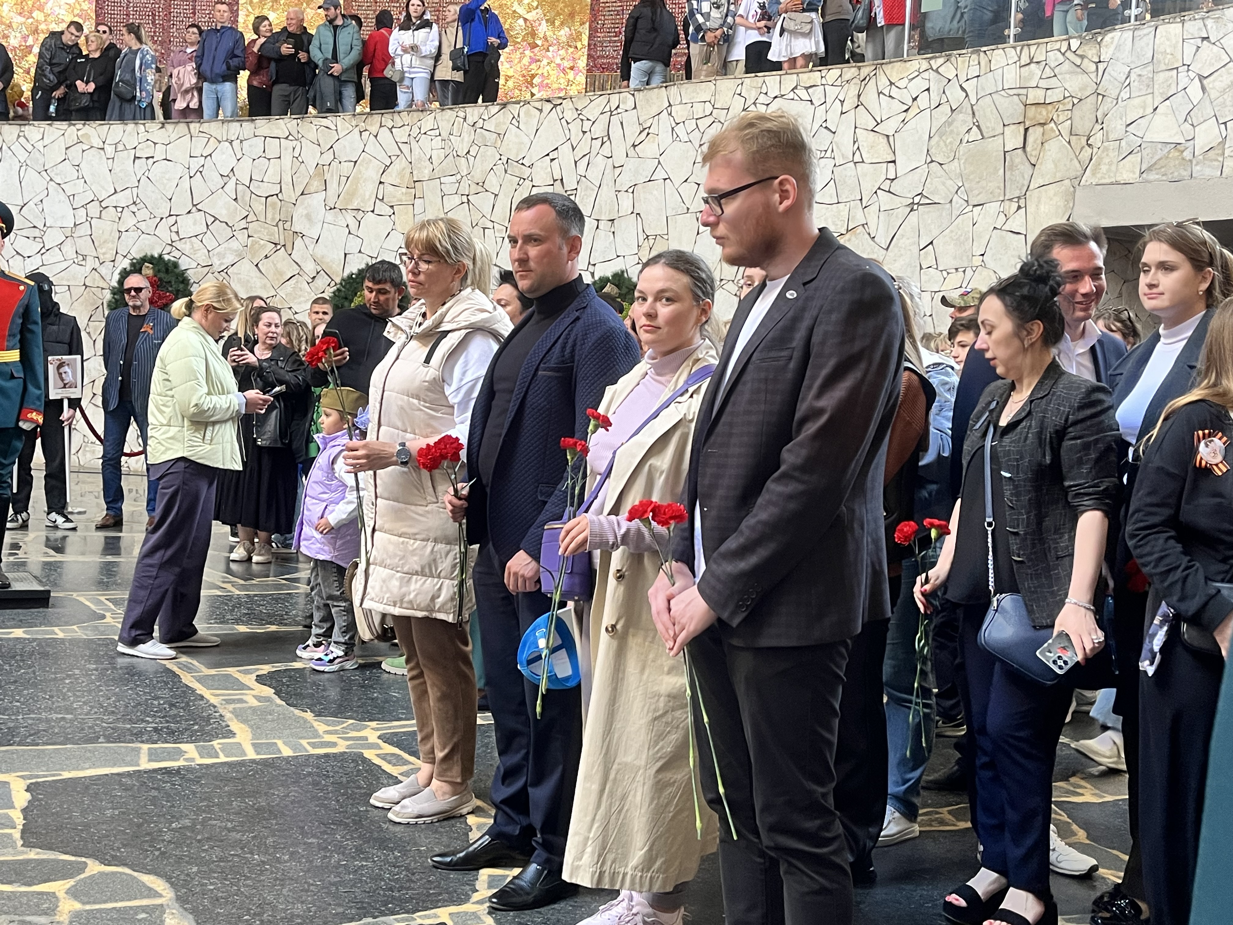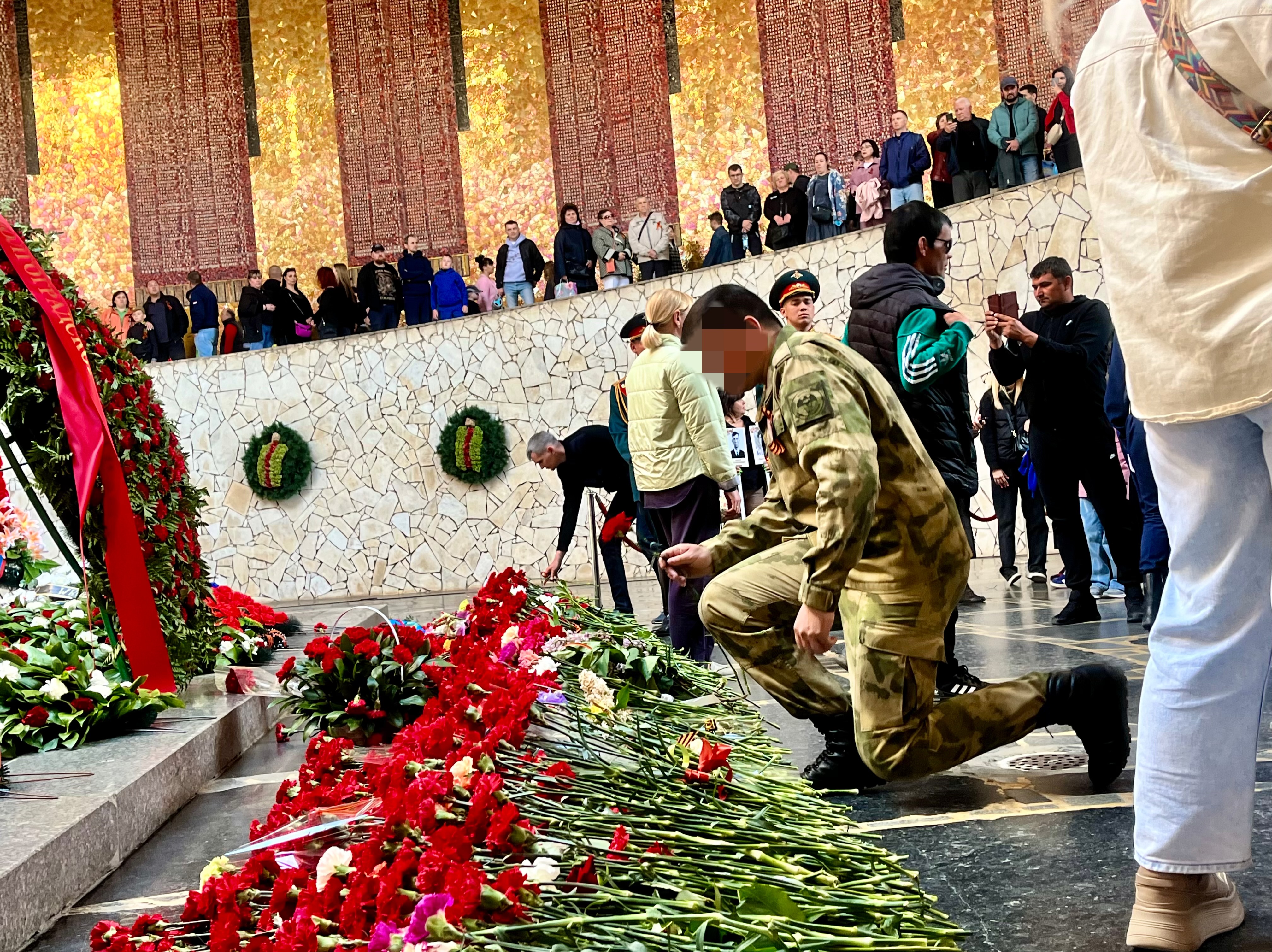 После этого совместно с участниками СВО депутаты ЛДПР в торжественной обстановке возложили цветы к вечному огню в самом знаковом месте - Зале Воинской Славы на Мамаевом Кургане.
