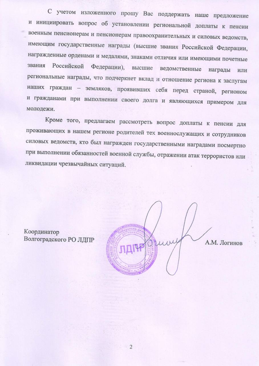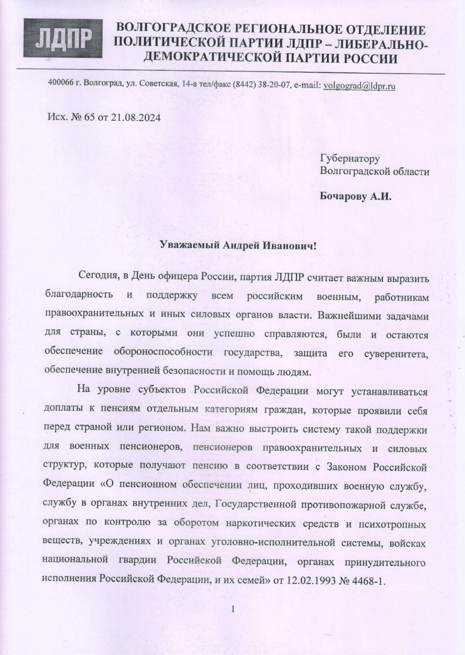 Координатор Волгоградского регионального отделения ЛДПР обратился к губернатору Волгоградской области Андрею Ивановичу Бочарову с инициативой о региональных доплатах к пенсии военнослужащим, сотрудникам правоохранительных и силовых ведомств ко Дню офицера России