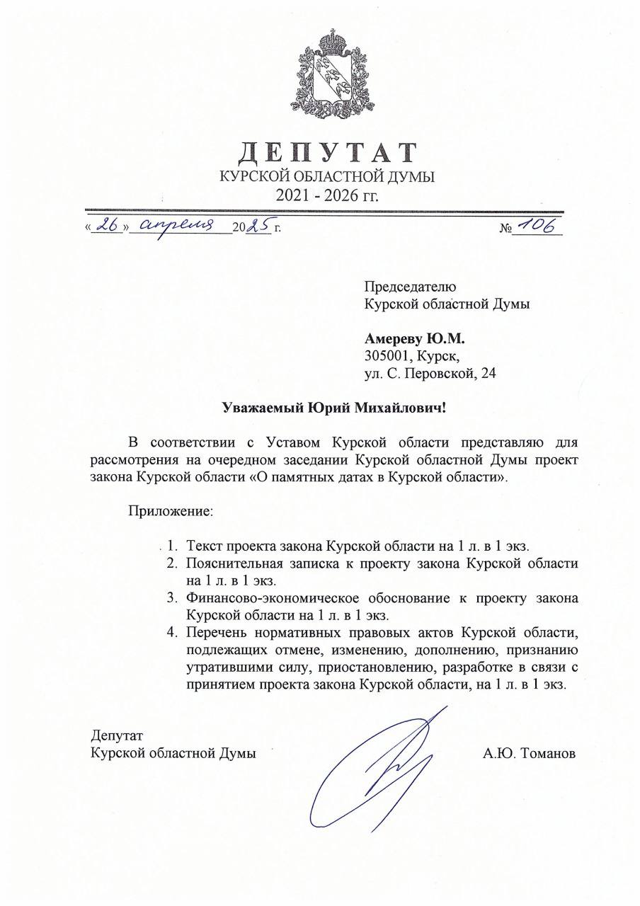 Председатель ЛДПР Леонид Слуцкий полностью разделяет предложение однопартийца, депутата Курской областной Думы, координатора регионального отделения Алексея Томанова установить в субъекте памятную дату 26 апреля — День освобождения Курской области от неонацистского режима