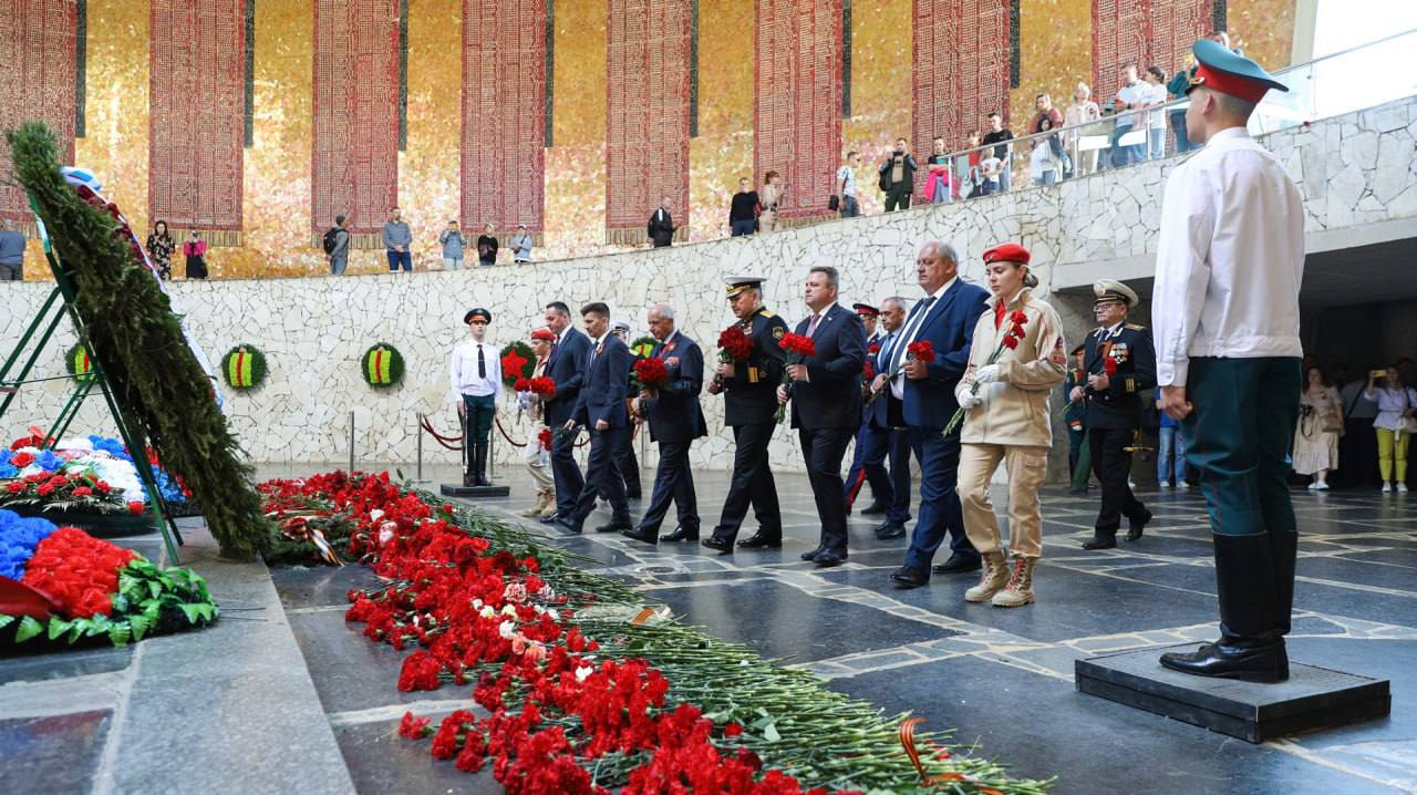 Торжественная церемония началась с возложения цветов в Зале Воинской Славы на Мамаевом кургане.Присутствующие почтили память павших защитников Родины, отдавших жизнь за свободу нашей страны. От Вечного огня, горящего на этом священном месте, была зажжена лампада, символизирующая мужество, стойкость и бессмертный подвиг нашего народа.