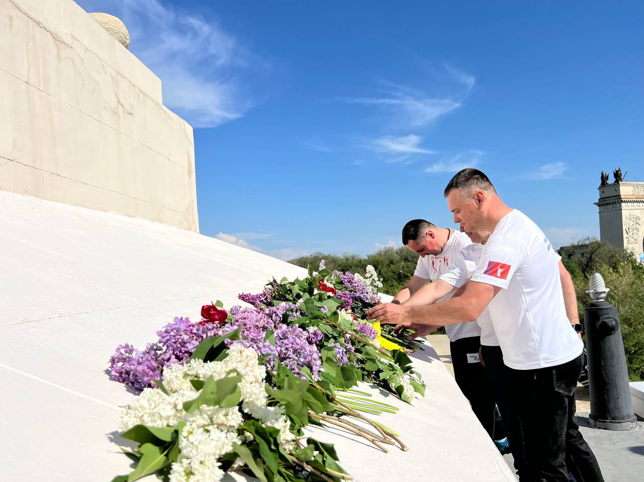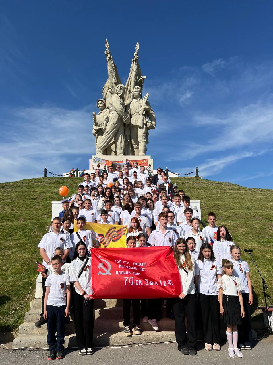У монумента «Соединение фронтов» участников встретили юные жители района. Вместе они возложили цветы к памятнику, почтили минутой молчания память защитников Сталинграда и всех героев, приближавших победу.